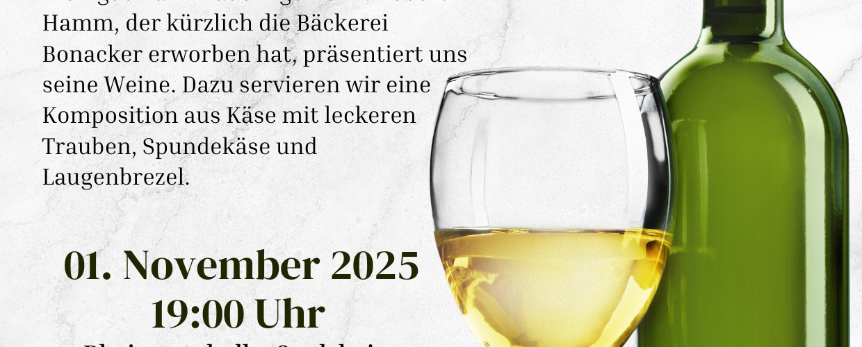 Liebe Gaulsheimerinnen und Gaulsheimer, in diesem Jahr probieren wir mal wieder etwas Neues aus und laden euch zur Weinprobe. Gemeinsam mit unserem frisch gebackenen Eigentümer der ehemaligen Bäckerei Bonacker Robert Hamm möchten wir euch zu einem schönen Abend bei Wein und kleinen Köstlichkeiten einladen. Tickets gibt es ab Mitte September über die Internetseite oder direkt über den Vorstand. Viele Grüße Mike Schumann 1. Vorsitzender